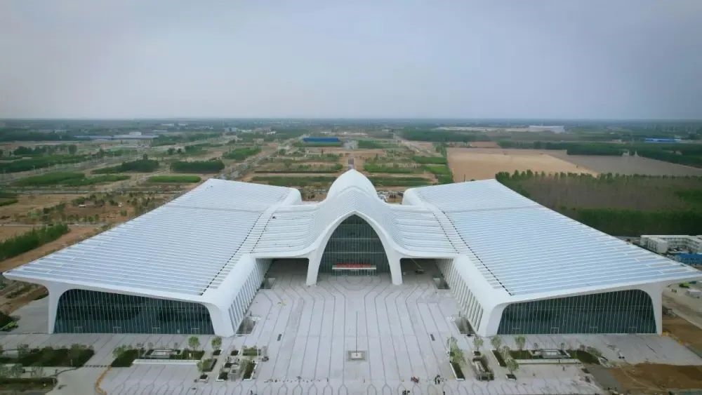Iko katika eneo la maandamano ya Qingdao SCO, Kituo cha Expo cha Pearl Expo cha Magnificent kinaacha hisia ya kudumu kando ya Ziwa la Ruyi. Iliyotazamwa kutoka juu, muundo wake wa "umoja" wa mviringo una muundo wake saba uliounganika, paa nyeupe kama ganda zilizopangwa radially. Wanaunda mawimbi ya matumbo, yasiyokuwa na nguvu ambayo huinuka sana kuelekea angani.
